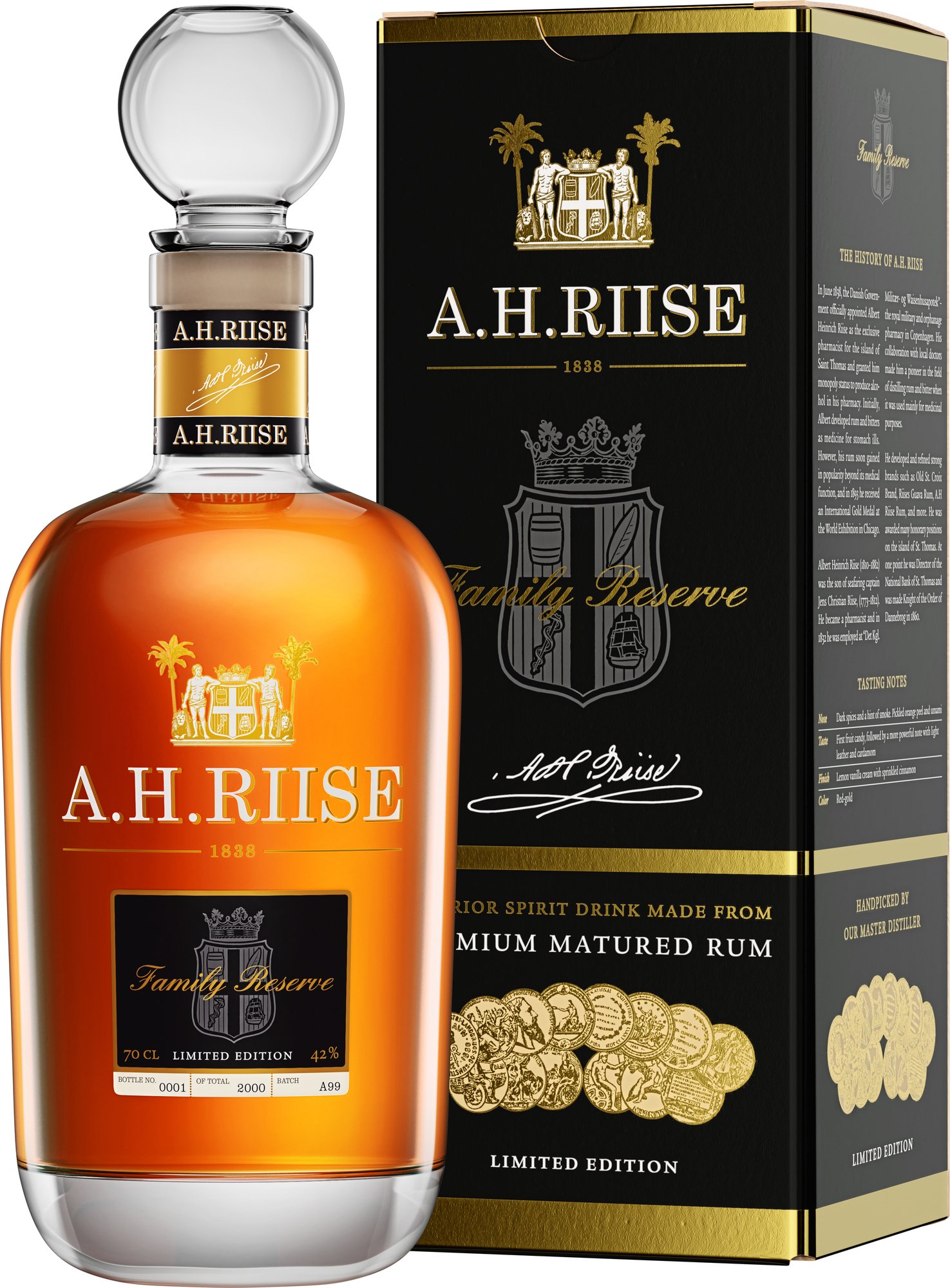 Dnes se tímto pojmenováním smí hrdit výhradně jen ten nejlepší a nejvýjimečnější rum, který značka A.H.Riise vyrobila. V překrásné fazetování karafě se nachází ultra prémiový rum, který je pravým mistrovským veledílem Master Distillera a který smí tvořit opravdu jen to nej – ty nejlepší kapky rumu nejvyšší třídy z nejstarších a nejvýjimečnějších sudů A.H. Riise. Je proto dostupný pouze v omezeném množství, ze kterého se ročně vyrobí pouze 3000 lahví.