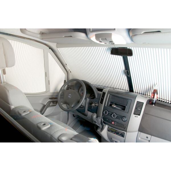 Zatemnění čelního okna dodávky Mercedes-Benz Sprinter Plisovaná roleta Remis REMIfront III/IV ve světle šedé barvě je určena do předního okna kabiny obytné dodávky Mercedes-Benz Sprinter. Na míru přizpůsobené řešení zatemnění pro kabinu řidiče chrání před zvědavými pohledy do vozidla a zároveň výrazně snižuje zahřívání nebo ochlazování vozidla. Rolety REMIfront se vyznačují vysokou kvalitou, jednoduchou montáží a robustním provedením. Díky vícevrstvému provedení mají tyto rolety výborné termoizolační vlastnosti. Jedná se o variantu s malým krytem senzoru. Klíčové vlastnosti rolety do čelního okna Remis REMIfront pro Mercedes-Benz Sprinter s malým krytem senzoru: Vhodná pro Mercedes-Benz Sprinter s malým krytem senzoru.Vyznačuje se vysokou kvalitou, jednoduchou montáží, bezúdržbovostí a robustností.Roleta má výborné termoizolační vlastnosti.Je vybavena zajištěním proti nechtěnému zatažení během jízdy.Ve staženém stavu není textilie téměř vidět a nezakrývá větrací otvory. Instalace rolet do předních oken: Systém zatemnění kabiny lze nainstalovat do vaší obytné dodávky dodatečně, montáž můžete provést sami.Instalace je velmi snadná: dělená přední roleta se upevňuje do upevňovacích bodů na A-sloupku.Pomocí trubkového systému je roleta vedena do středu čelního skla, zpětné zrcátko může zůstat na svém místě.Přední roleta je navíc vybavena bezpečnostním zámkovým systémem, který zabraňuje náhodnému otevření přední části za jízdy.Přední plisovaná roleta REMIfront III/IV není vhodná pro vozidla s úložným prostorem nad čelním sklem a pro vozy s integrovanými airbagy v A a B sloupcích. Parametry rolety do čelního okna Remis REMIfront pro Mercedes-Benz Sprinter s malým krytem senzoru: pro vozidla: Mercedes-Benz Sprinter, všechny modely, od 03/2024barva: světle šedávarianta: přední část pro vozidla s malým krytem senzoru a spodní částí krytu MPCrozměry balení: 90 × 30 × 27 cmhmotnost: 5 kg