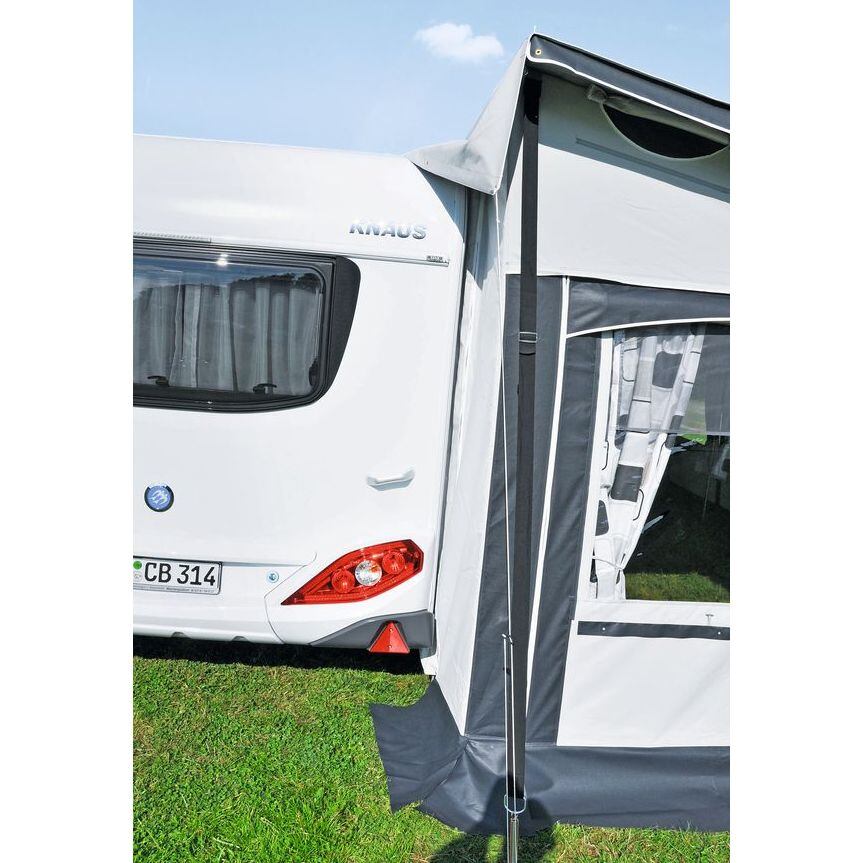 Celoroční samostojící předstan Frankana Freiko AllgäuCeloroční předstan Frankana Freiko Allgäu je extra prostorným a mimořádně komfortním celoročním předstanem ke karavanu nebo k obytnému vozu. Kvalitní a odolný materiál se postará o pohodlí za jakéhokoliv počasí, dokonce i v zimě. Při extrémních podmínkách je však vhodné zvážit přikoupení bouřkových tyčí nebo sady přídavných popruhů pro ještě lepší stabilitu. Díky dvojitému kedru je možné téměř libovolně přichytit dodatečné podpěrné tyče. Všechna okna mohou být uzavřena zipem a ke stanu lze přichytit okapovou lištu (veškeré doplňky naleznete v příslušenství). Klíčové vlastnosti celoročního předstanu Frankana Freiko Allgäu:Samostojící předstan.Extrémně prostorný a vysoce odolný. Vyroben z omyvatelné a snadno čistitelné PVC plachtoviny, která je odolná proti povětrnostním vlivům.Flexibilní konstrukce. Vyměnitelné a odnímatelné stěny pro přizpůsobení prostoru podle potřeby.Přední stěna se skládá ze dvou dílů, které jsou zaměnitelné. Vchodové dveře lze srolovat. Vertikální kanály na suchý zip umožňují další fixaci tyčí a rychlé otevírání a zavírání.Boční stěny jsou vyměnitelné, vybavené uzavíratelným stálým horním větráním. Jedna boční stěna má velká gázová okna s průhledným krytem a okenní klapkou z PVC nahoře. Druhá boční stěna obsahuje bočně výsuvné dveře, gázovou síť, průhlednou fólii a okenní klapku z PVC.Zadní stěna se skládá se ze dvou částí, gumové pěnové výdutě lze připevnit pomocí zipu. Výška zadní stěny se pohybuje od 235 do 250 cm.Předstan je vybaven šesti předinstalovanými bouřkovými sponami.Ocelový rám o průměru 32 mm (5 střešních tyčí, 8 vertikálních tyčí, přístřeškové tyče). Obsah balení:stan s 6 předem nainstalovanými upínacími sponami napínací materiál tyče záclony se zavěšením pro srolováníParametry celoročního předstanu Frankana Freiko Allgäu:material: 100 % PVC Poly Vinyl Chloridetyče: ø 32 mm ocelinstalační výška: 235 – 250 cmšířka: 450 – 650 cmhloubka: 250 cm nebo 300 cmbarva: šedáHloubka stanu 250 cm: šířka stanu:450 cm500 cm550 cm600 cm650 cmhmotnost:110 kg115 kg120 kg130 kg134 kgrozměry balení v cm:120 x 80 x 69120 x 80 x 62120 x 80 x 63120 x 80 x 58120 x 80 x 61 Hloubka stanu 300 cm: šířka stanu:450 cm500 cm550 cm600 cm650 cmhmotnost:116 kg121 kg126 kg131 kg136 kgrozměry balení:120 x 80 x 61120 x 80 x 63120 x 80 x 63120 x 80 x 66120 x 80 x 66Video: