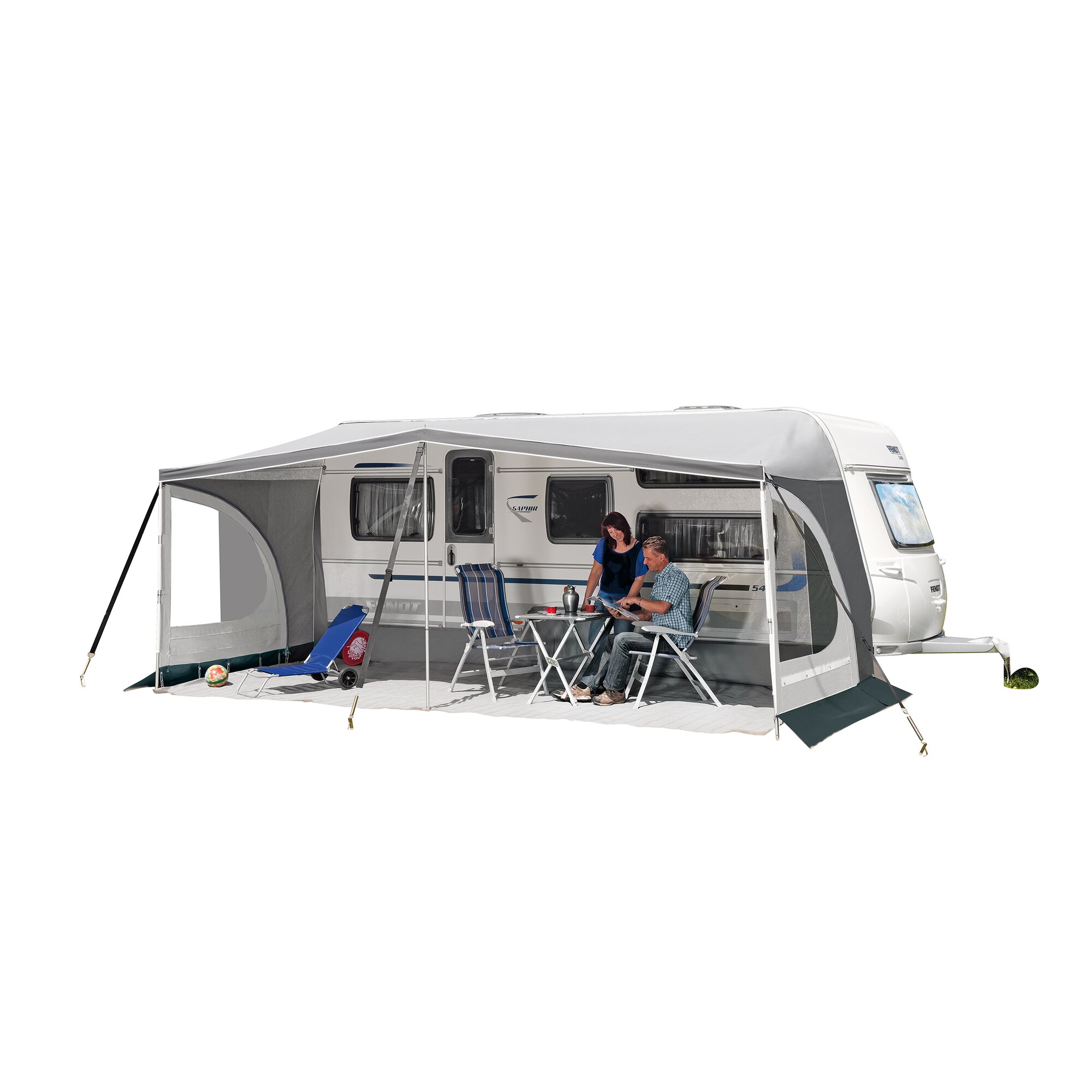 Stanový přístřešek Herzog Bermuda je ideálním doplňkem pro Vaši dovolenou v karavanu. Díky pohodlné hloubce 235 cm a robustním bočním dílům, které se snadno připojují ke stříšce pomocí zipů, nabízí dokonalou ochranu ze všech stran. Potřebná velikost závisí na rozměrech vašeho karavanu. Přídavná přední stěna promění Bermudu v kompletní markýzu. Ta se ke štítu a bočním stěnám připevňuje pomocí zipu.