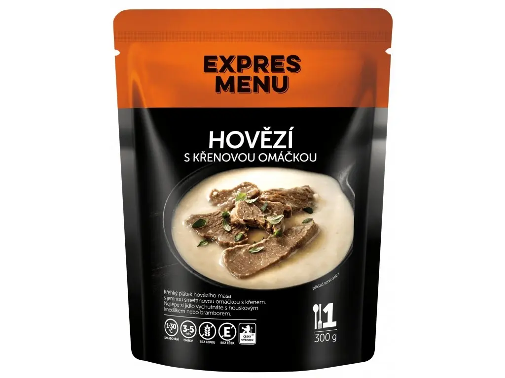 Koprovka s vejci – snadná omáčka, kterou si vychutnáte i mimo pohodlí domovaSmetanová omáčka se třemi vařenými vajíčky. Ideální pro všechny milovníky klasické koprové omáčky.Jako příloha se hodí brambory.Omáčka je sterilovaná a připravená k okamžitému podávání. Není potřeba žádné dochucovadlo.Hotové jídlo, které sbalíte s sebou na cesty, do stanu nebo karavanu.Vlastnosti koprovky od EXPRES MENUbalení: 600 g (2 porce)složení bez lepku a bez éčekhotové sterilované jídlo od české rodinné firmy z Trutnovasnadná přípravavhodné pro vegetariányideální pro přípravu na cestáchSloženímléko, voda, smetana, cukr řepný, vejce 3 ks, rýžová mouka, kukuřičná mouka, máslo, kopr sterilovaný 4 % (voda, kopr, ocet kvasný, cukr, sůl), ocet kvasný, sůl kamennáPříprava jídlaKoprovku s vejci od EXPRES MENU můžete připravit třemi způsoby:Sáček s jídlem vložte do mikrovlnné trouby a ohřívejte zhruba 2 až 3 minuty při výkonu300 W nebo dokud nebude jídlo teplé. Při ohřevu buďte opatrní, delší doba ohřevu může vést k deformaci obalu.V další variantě stačí vyprázdnit obsah sáčku na talíř a ohřívejte v mikrovlnné troubě zhruba 2 minuty.Pokud nemáte k dispozici mikrovlnnou troubu, stačí sáčky vložit do hrnce s vařící vodou zhruba na 10 minut. Před podáváním jídla promačkejte.SkladováníVýrobek skladujte při teplotě od +1 °C do +30 °C. Po otevření skladujte v chladničce a spotřebujte do 48 hodin.Datum spotřebyMinimální trvanlivost je uvedena na obalu. Obvyklé datum spotřeby jsou 2 roky.Nutriční hodnoty na 100 gEnergetická hodnota:350 kJ / 83 kcalTuky:4,4 gNasycené mastné kyseliny:1,8 gSacharidy:7,5 gz toho cukry:4,5 gBílkoviny:4,4 gVláknina:0,0 gSůl:0,8 g