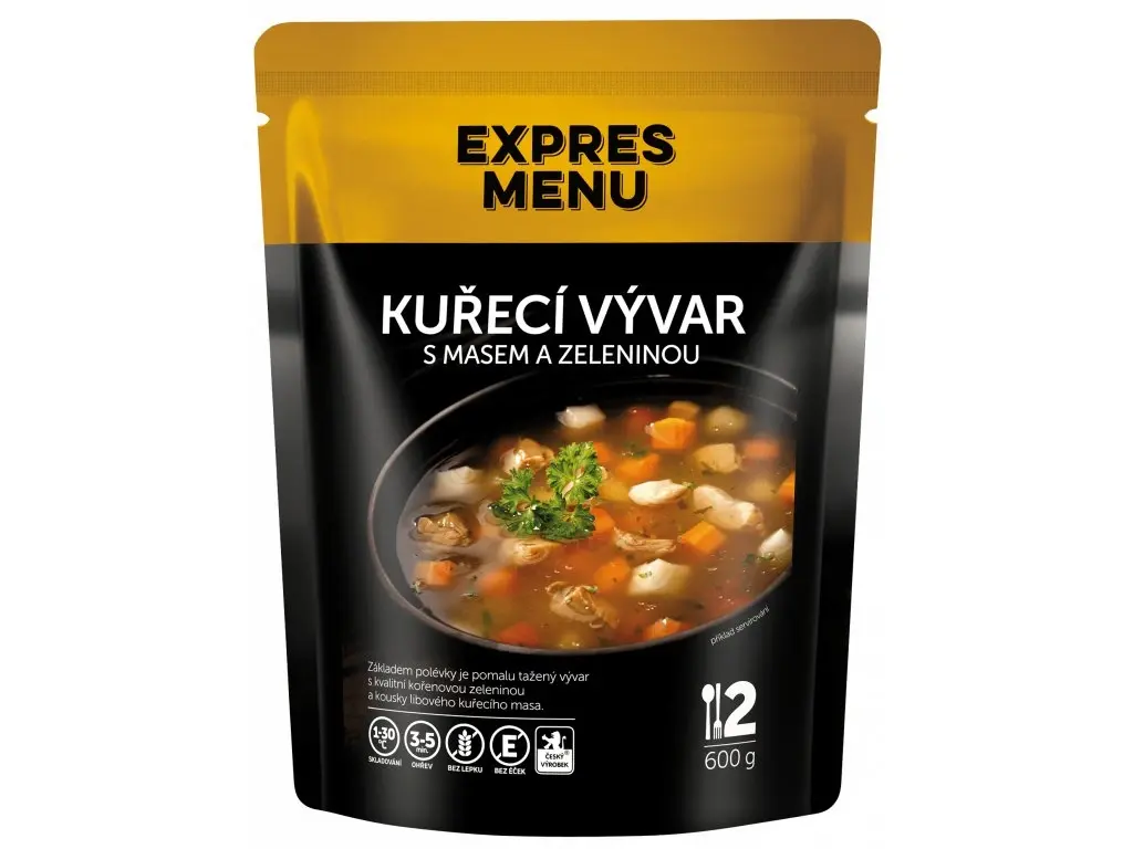 Kotlíkový guláš – tradiční jídlo k táborákuPro ty, kteří hledají klasickou českou specialitu s prvky táboráku, přináší EXPRES MENU kotlíkový guláš. Tento pokrm je založen na vysmažené slanině, která slouží jako základ pro restování paprik, rajčat a cibule. Do omáčky se pak přidává tažený hovězí vývar a pomalu dušené hovězí a vepřové maso, což vytváří hlubokou a komplexní chuť. Hotové jídlo, které stačí pouze ohřát, přidat přílohu a můžete servírovat.Vlastnosti kotlíkového guláše od EXPRES MENUbalení: 600 g (2 porce)složení bez lepku a bez éčekhotové sterilované jídlo od české rodinné firmy z Trutnovasnadná přípravaideální pro přípravu na cestáchSloženíhovězí maso přední (16 %), vepřová plec (16 %), hovězí vývar (voda, hovězí maso a kosti), cibule, špek, rajčata, papriky, rýžová mouka, kukuřičná mouka, česnek, paprika mletá, sůl kamenná, pepř, majoránkaPříprava jídlaKotlíkový guláš EXPRES MENU můžete připravit třemi způsoby:Sáček s jídlem vložte do mikrovlnné trouby a ohřívejte zhruba 2 až 3 minuty při výkonu300 W nebo dokud nebude jídlo teplé. Při ohřevu buďte opatrní, delší doba ohřevu může vést k deformaci obalu.V další variantě stačí vyprázdnit obsah sáčku na talíř a ohřívejte v mikrovlnné troubě zhruba 2 minuty.Pokud nemáte k dispozici mikrovlnnou troubu, stačí sáčky vložit do hrnce s vařící vodou zhruba na 10 minut. Před podáváním jídla promačkejte.SkladováníVýrobek skladujte při teplotě od +1 °C do +30 °C. Po otevření skladujte v chladničce a spotřebujte do 48 hodin.Datum spotřebyMinimální trvanlivost je uvedena na obalu. Obvyklé datum spotřeby jsou 2 roky.Nutriční hodnoty na 100 gEnergetická hodnota:541 kJ /129 kcalTuky:9,4 gNasycené mastné kyseliny:3,3 gSacharidy:4,9 gz toho cukry:0,9 gBílkoviny:7,4 gVláknina:0,4 gSůl:1,1 g