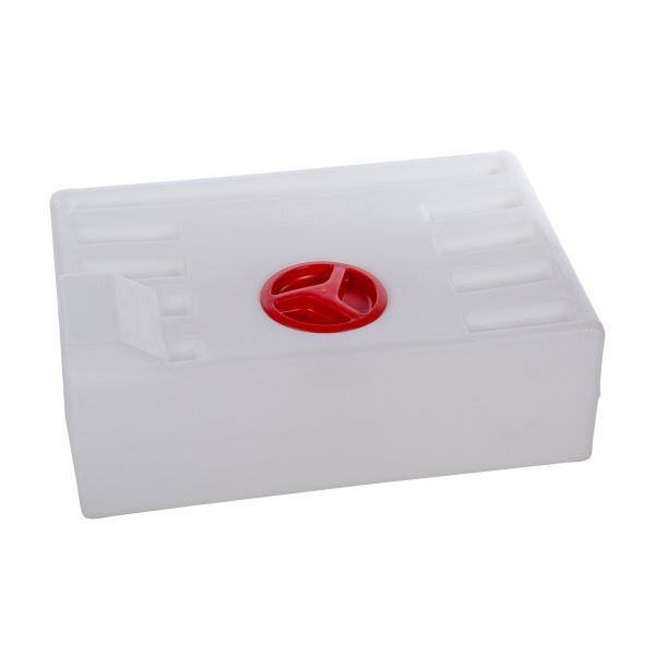 Nádrž na vodu 40 l s velkým servisním otvorem Vodní nádrž Goebel SM 17040 o objemu 40 litrů je vybavena velkým servisním otvorem o průměru 120 mm s víkem a dvěma zaslepenými plnícími hrdly o průměru 40 a 33 mm. Pro uchycení nádrže jsou určeny 4 vyztužené patky s drážkou pro šroub. Klíčové vlastnosti vodní nádrže Goebel SM 17040, 40 l: Servisní otvor s víkem o průměru 120 mm.2 zaslepená plnicí hrdla s průměry 33 a 40 mm.Napouštěcí a vypouštěcí otvory lze zřídit kdekoli v plášti nádrže.Nádrž je vyrobena z netoxického polyethylenu. Parametry vodní nádrže Goebel SM 17040, 40 l: typ: SM 17040barva: bílámateriál: polyetylen (PE)objem nádrže: 40 lrozměry (Š × V × H): 725 × 220 × 320 mmhmotnost: 4 kg