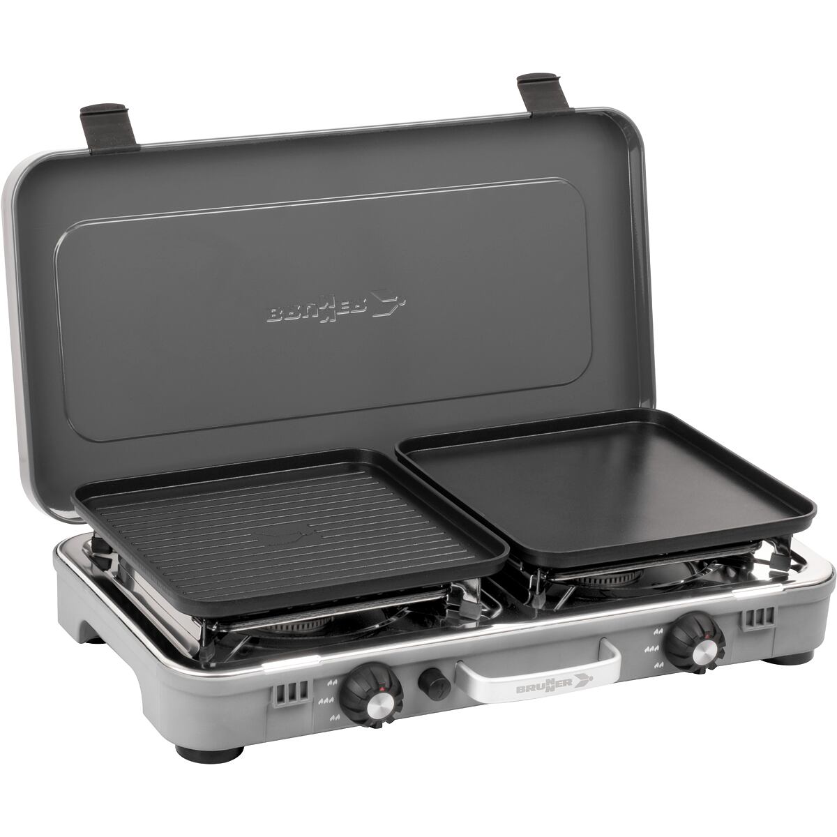 Praktický přenosný dvojplotýnkový vařičPlynový vařič Brunner Devil Kookmaster má dva hořáky s plochou z nerezové oceli. Rychlé a bezpečné uvedení do provozu zajišťuje piezoelektrické zapalování. Snazší převoz a uskladnění umožňuje praktické víko a madlo.Klíčové vlastnosti plynového vařiče Brunner Devil Kookmaster:Dva vysoce výkonné hořáky s robustními podpěrami pánví pro plnohodnotné vaření v přírodě.Jednoduchý transport díky víku, madlu a tašce k přenášení.Pohodlné a bezpečné piezoelektrické zapalování.Adaptér pro malé hrnce je součástí balení.Klíčové vlastnosti plynového vařiče Brunner Devil Kookmaster:barva: šedámateriál: nerez ocelpočet hořáků: 2PROVOZNÍ TLAK (VARIANTA)30 MB50 MBspotřeba plynu348 g/h348 g/hjmenovitý výkon4,8 kW4,8 kWšířka53,5 cm53,5 cmvýška9,5 cm9,5 cmhloubka31 cm31 cmhmotnost3,6 kg3,6 kgvelikost balení53,5 x 31 x 9,5 cm53,5 x 31 x 9,5 cm