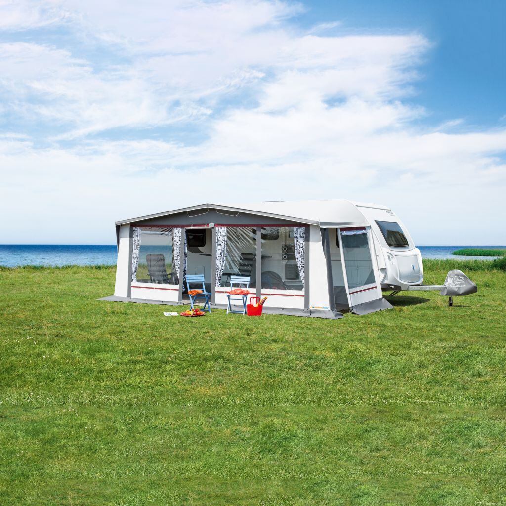 Stan ke karavanu DWT LuxStylový předstan DWT Lux ke karavanu potěší každého karavanistu svým živým designem a bohatou výbavou za přijatelnou cenu. Díky libovolně odnímatelným stěnám, stan snadno proměníte v otevřený altán, který poskytne příjemný stín především v horkých letních dnech. Připojení je zajištěno dvojitým kedrem, díky kterému není nutné vrtat do stěny karavanu očka pro zavěšení tyčí. Stanová konstrukce NENÍ součástí balení! Doporučujeme objednat ocelovou konstrukci. Při extrémních podmínkách je vhodné zvážit dokoupení dvou ocelových tyčí pro maximální vyztužení. Další možností je hliníková stanová konstrukce Barcelona, která je značně lehčí než ocelová, ocelová je však robustnější a odolnější. Standardní konstrukci je navíc možné dodatečně vyztužit dvěmi prohnutými střešními tyčemi.Klíčové vlastnosti předstanu DWT Lux:Libovolně odnímatelné stěny.Boční stěny s rolovatelnými okny.Střecha je v čelní části vybavena permanentní ventilací.Stan je vyroben z vysoce odolného polyesteru.Rolovací dveře na přední i obou bočních stěnách.Obsah balení:napínací materiálpodlahová suknězávěsytransportní taškakryt kolastanParametry předstanu DWT Lux:materiál: 100% PES polyester, dvojitě potažený PVChloubka stanu: 240 cmbarva: šedá, červenáTabulka velikostí:VelikostRozměr A (obvod)HmotnostVelikost balení12881 – 910 cm24 kg119 x 41 x 24 cm13911 – 940 cm26 kg119 x 42 x 24 cm14941 – 970 cm28 kg119 x 43 x 24 cm15971 – 1000 cm30 kg119 x 44 x 24 cm161001 – 1030 cm32 kg119 x 45 x 24 cm