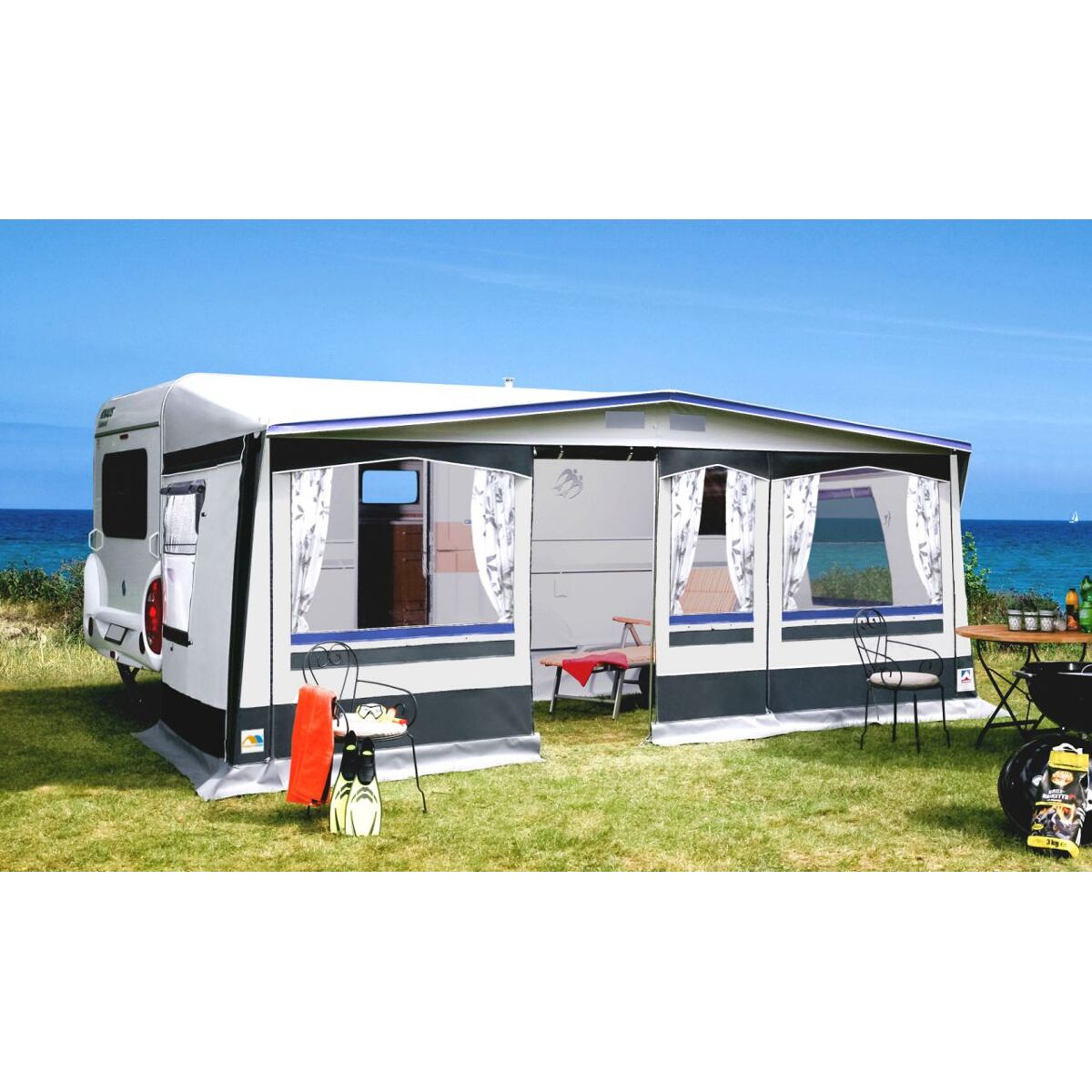 Přední stan ke karavanu Hahn Zelta MeiraPředstan ke karavanu Hahn Zelte Meira nabízí dostatek prostoru pro celou rodinu. Tento prostor lze ještě rozšířit o dokoupitelnou stanovou přístavbu. Stan je opatřen dvojitým kedrem na očka k zavěšení horizontálních stanových tyčí ke karavanu bez nutnosti vrtání do stěny. Očka na karavan nejsou součástí balení, nutno dokoupit zvlášť.Sada předstanu dále obsahuje klipy pro bouřkové popruhy (popruhy lze dokoupit samostatně). Volitelně lze dokoupit lehčí konstrukci ze sklolaminátových tyčí, která sníží celkovou hmotnost předstanu o 10 kg. Pokud si potřebujete ověřit správnost postupu při měření, můžete využít náš článek Jak naměřit délku pro stan ke karavanu.Klíčové vlastnosti předstanu Hahn Zelta Meira:Čelní stěna se skládá ze 2 dílů, které lze libovolně kombinovat.Složením stěn lze předstan přeměnit v otevřenou verandu.Ventilační síťka s otevíráním na zip zajistí uvnitř předstanu optimální klima.Obě boční stěny jsou opatřeny velkými rolovacími okny s moskytiérou a možností přeměny v dveře.Střecha je vyrobena z materiálu Tencate WM19, vnitřní strana s potiskem.Díky velkým oknům je uvnitř předstanu dostatek světla.Pro větší soukromí stačí jen zatáhnout závěsy, které jsou součástí balení.Součástí balení je dále krycí plachta podvozku i přepravní taška.Parametry předstanu Hahn Zelta Meira:materiál: Tencate WR18 – 5 % bavlna, 95 % PES polyesterhloubka: 240 cmtyče: ocelhmotnost: 51 – 58 kgbarva: šedá, antracitTabulka velikostí:Rozměr A (obvod):Hloubka stanu:Rozměry balení:Hmotnost:841 – 875 cm240 cm120 x 65 x 38 cm51 kg876 – 910 cm240 cm120 x 65 x 38 cm52 kg911 – 945 cm240 cm120 x 65 x 38 cm53 kg946 – 980 cm240 cm120 x 65 x 38 cm54 kg981 – 1015 cm240 cm120 x 65 x 38 cm55 kg1016 – 1050 cm240 cm120 x 65 x 38 cm56 kg1051 – 1085 cm240 cm120 x 65 x 38 cm57 kg1086 – 1120 cm240 cm120 x 65 x 38 cm58 kg
