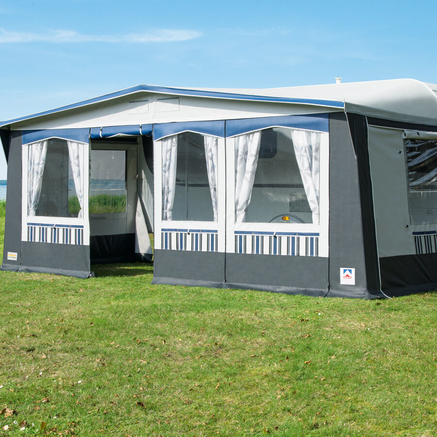Přední stan ke karavanu Rhön DCUniverzálnost předstanu Rhön DC je jen jednou z mnoha výhod. Stan lze samozřejmě kompletně uzavřít, čímž se interiér karavanu až zdvojnásobí. V horkých letních dnech vás navíc překvapí možnost odepnutí všech stěn a snadná přeměna v otevřený altán. Hodí se pro karavany s aerodynamickým designem jako je Knaus, Bürstner, Eifelland atd. Stan je vybaven dvojitým kedrem pro uchycení na karavan a rolovacími záclonkami. Tyče nejsou součástí balení. Lze je objednat zlášť. Pro útulnější interiér doporučujeme dokoupit svislé záclonky do stanu. Produkty naleznete v příslušenství.Klíčové vlastnosti předstanu Rhön DC:Vhodný pro celoroční kempování.Kvalitní snadno omyvatelný materiál.Disponuje odolnými, krytými zipy.Stan se skládá ze čtyř odepínatelných dílů.Během chvilky lze stan jednoduše přeměnit v otevřenou letní verandu.Všechna okna je možné uzavřít pomocí rolovacích plachet.Dveře se dají umístit vlevo, vpravo, nebo na střed, dají se také srolovat.Boční stěny jsou odnímatelné, každá s dveřmi.Okna s rolovací moskytiérou a rolovací plachtou se suchým zipem pro uchycení.Střecha je bezešvá, ze stejného materiálu jako přední a boční stěny.Přesah střechy 18 cm pro dokonalou ochranu před deštěm.Obsah balení:upínací materiálpodlahová suknězávěsytransportní obalkryt podběhu kolastanParametry předstanu Rhön DC:materiál: 100 % PES polyester s oboustranným zátěremváha: 35 – 43 kg (dle velikosti)barva: šedá, modráTabulka velikostíRozměr A (obvod)HloubkaVelikost baleníVáha856 – 880 cm240 cm120 x 42 x 41 cm35 kg881 – 905 cm240 cm120 x 42 x 41 cm36 kg906 – 930 cm240 cm120 x 42 x 41 cm37 kg931 – 955 cm240 cm120 x 42 x 41 cm38 kg956 – 980 cm240 cm120 x 42 x 41 cm39 kg981 – 1005 cm240 cm120 x 42 x 41 cm40 kg1006 – 1030 cm240 cm120 x 42 x 41 cm41 kg1031 – 1055 cm240 cm120 x 42 x 41 cm42 kg1056 – 1080 cm240 cm120 x 42 x 41 cm43 kg