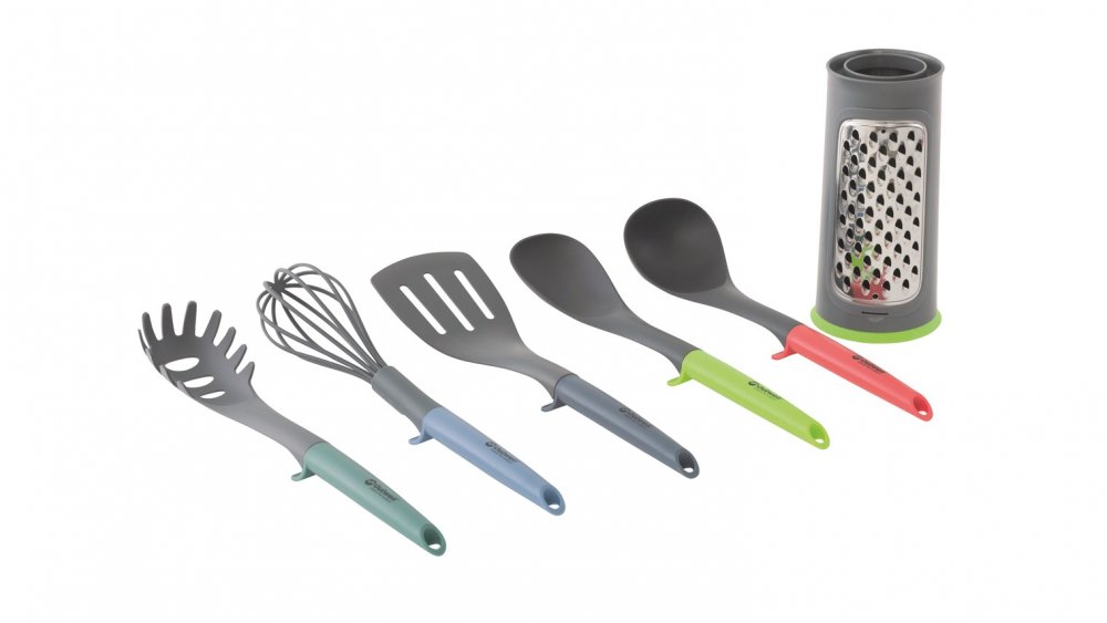 Sada kuchyňského náčiní, prostorově úsporná. Vhodné pro všechny hrnce a pánve, protože materiál nezpůsobuje škrábance. Odolný vůči teplu až do 220 ° C. Vysoce kvalitní materiál, vhodný do myčky nádobí