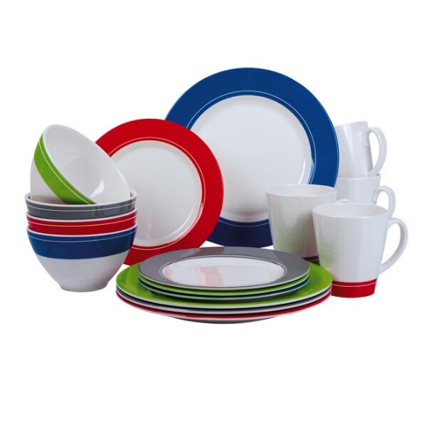 Jídelní souprava Camp4 Burano ve čtyřech barváchSada nádobí Camp4 Burano pro 4 osoby je ozdobená 4 různými barvami. Sada obsahuje jídelní talíře, dezertní talíře, misky a hrnky s jednobarevnou dekorací na bílém podkladu. Nádobí je vyrobeno z materiálu bezpečného pro kontakt s potravinami a vhodného pro mytí v myčce nádobí při nižší teplotě. Nádobí není vhodné pro ohřev v mikrovlnné troubě.Klíčové vlastnosti sady nádobí Camp4 Burano pro 4 osoby:Je vyrobena z melaminu, který ideální pro každodenní použití.Lze ji mýt v myčce na nádobí, ale pouze při teplotě maximálně 70 °C.Jídelní set obsahuje:4x jídelní talíř, ø 25 cm4x dezertní talíř, ø 20 cm4x misku, objem 550 ml4x hrnek s uchem, objem 400 mlParametry jídelní sady Camp4 Burano:barva: bílá, červená, limetková, modrá, šedámateriál: melaminpočet kusů v sadě: 16 kshmotnost: 2,3 kg