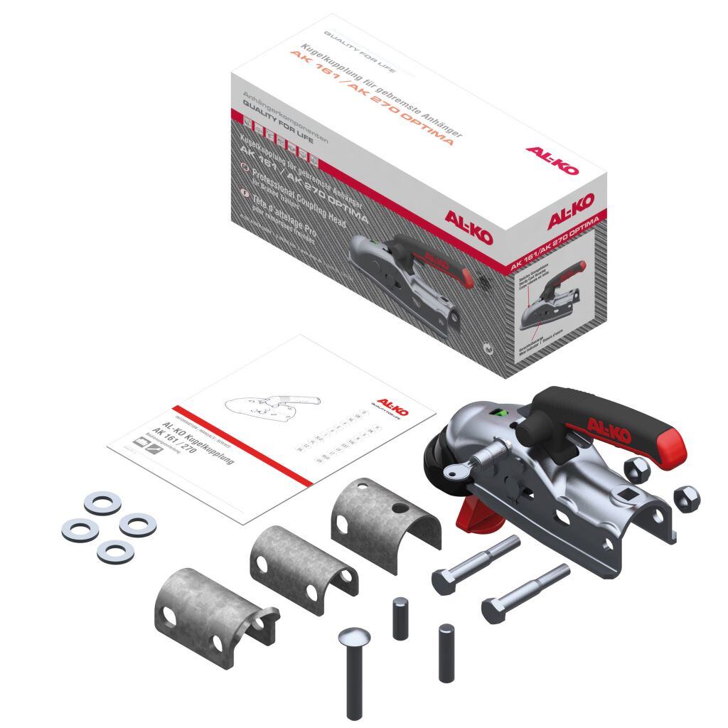 Spojovací zařízení pro přívěsy vybavené nájezdovou brzdou Spojovací hlava AL-KO AK 161 je vhodná pro přívěsy vybavené nájezdovou brzdou s hmotností do 1600 kg. Patentovaný bezpečnostní systém je vybaven těmito funkcemi: Ukazatel připojení – pokud je zřetelně viditelný zelený ukazatel, přívěs je správně připojen k tažnému vozidlu.Ukazatel opotřebení – ukazatel na boku hlavy ukazuje, zda bylo dosaženo meze opotřebení koule tažného vozidla nebo spojovací hlavy.Rukojeť z měkčeného plastu je vybavena pojistkou zabraňující samovolnému a nechtěnému otevření spojovací hlavy. Tvar rukojeti zabraňuje sklouznutí ruky. Kryt soft-dock chrání před poškozením tažného vozidla při připojování přívěsu. Klíčové vlastnosti spojovací hlavy AL-KO AK 161: Vhodná pro přívěsy s nájezdovou brzdou s hmotností do 1600 kg.Ukazatel připojení indikuje, zda je přívěs správně připojen k tažnému vozidlu.Ukazatel opotřebení indikuje, zda bylo dosaženo meze opotřebení tažné koule nebo spojovací hlavy.Rukojeť vyrobená měkčeného plastu má protiskluzový tvar.Rukojeť je vybavena pojistkou zabraňující samovolnému a nechtěnému otevření spojovací hlavy.Kryt soft-dock chrání před poškozením tažného vozidla. Parametry spojovací hlavy AL-KO AK 161: maximální hmotnost přívěsu: 1600 kg materiál: ocel šířka: 79 mm výška: 111 mm délka: 258 mm hmotnost: 1,7 kg rozměry balení (Š × V × H): 26,8 × 11,2 × 8,8 cm Video: