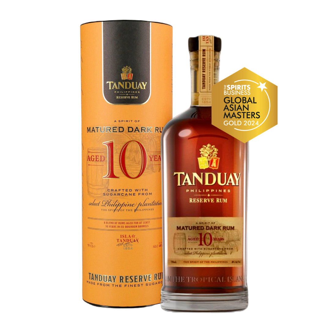 Tanduay Reserve 10 Year Old je prémiový filipínský rum z produkce Tanduay Distillers, Inc., jedné z největších světových rumových značek, založené v roce 1854 na Filipínách. Vyrábí se z cukrové třtiny pěstované na vulkanických půdách tamních ostrovů a zraje minimálně 10 let v sudech po bourbonu z amerického dubu, což mu dodává bohatý a vyvážený charakter. S obsahem alkoholu 40 % je tento rum navržen pro pomalé popíjení čistý nebo na ledu, případně jako základ pro luxusní koktejly, jako je Old Fashioned nebo Daiquiri. Jeho tmavě jantarová barva a dlouhé zrání odrážejí tradici a řemeslnou kvalitu, kterou Tanduay reprezentuje.
