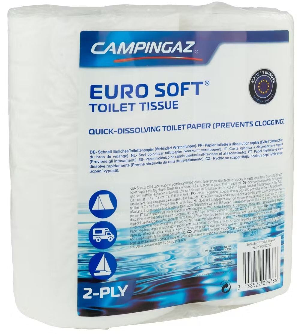 Dvojvrstvý rozkladový toaletní papírToaletní papír pro chemická WC Campingaz Euro Soft vyrobený z celulózy je vhodný pro všechny chemické toalety. Při kontaktu s dezinfekčním prostředkem Campingaz Instablue se velmi snadno rozpouští, takže v odpadním zásobníku nevznikají chomáče a hrudky papíru a nádrž pojme více odpadu.Klíčové vlastnosti toaletního papíru pro chemická WC Campingaz Euro Soft:Balení obsahuje 4 role rozkladového toaletního papíru.182 listů měkkého dvojvrstvého papíru.Vhodný pro všechna chemická WC.Ideální pro použití společně s přípravkem Instablue.Snadno se rozloží v odpadové nádrži, která tak pojme více odpadu.Parametry toaletního papíru pro chemická WC Campingaz Euro Soft:balení obsahuje: 4 rolerole obsahuje: 182 listů