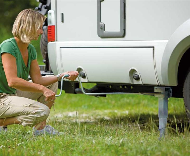 Zajistěte, aby vozidlo bezpečně stálo. Upevnění k obytným vozům s rámem AL-KO nebo prodloužením rámu. Od modelového roku 8/95 jsou připraveny všechny montážní body na rámu. U starších vozidel si otvor vyvrtá uživatel sám. Robustní zvedací podpěra pro pevné a bezpečné postavení. Zvedací podpěra se ovládá klikou
